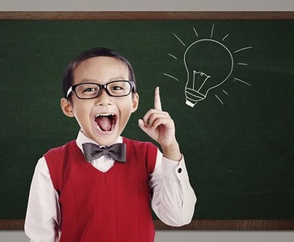 Young boy pointing at light bulb illustration on classroom chalkboard, representing ideas and innovation.
