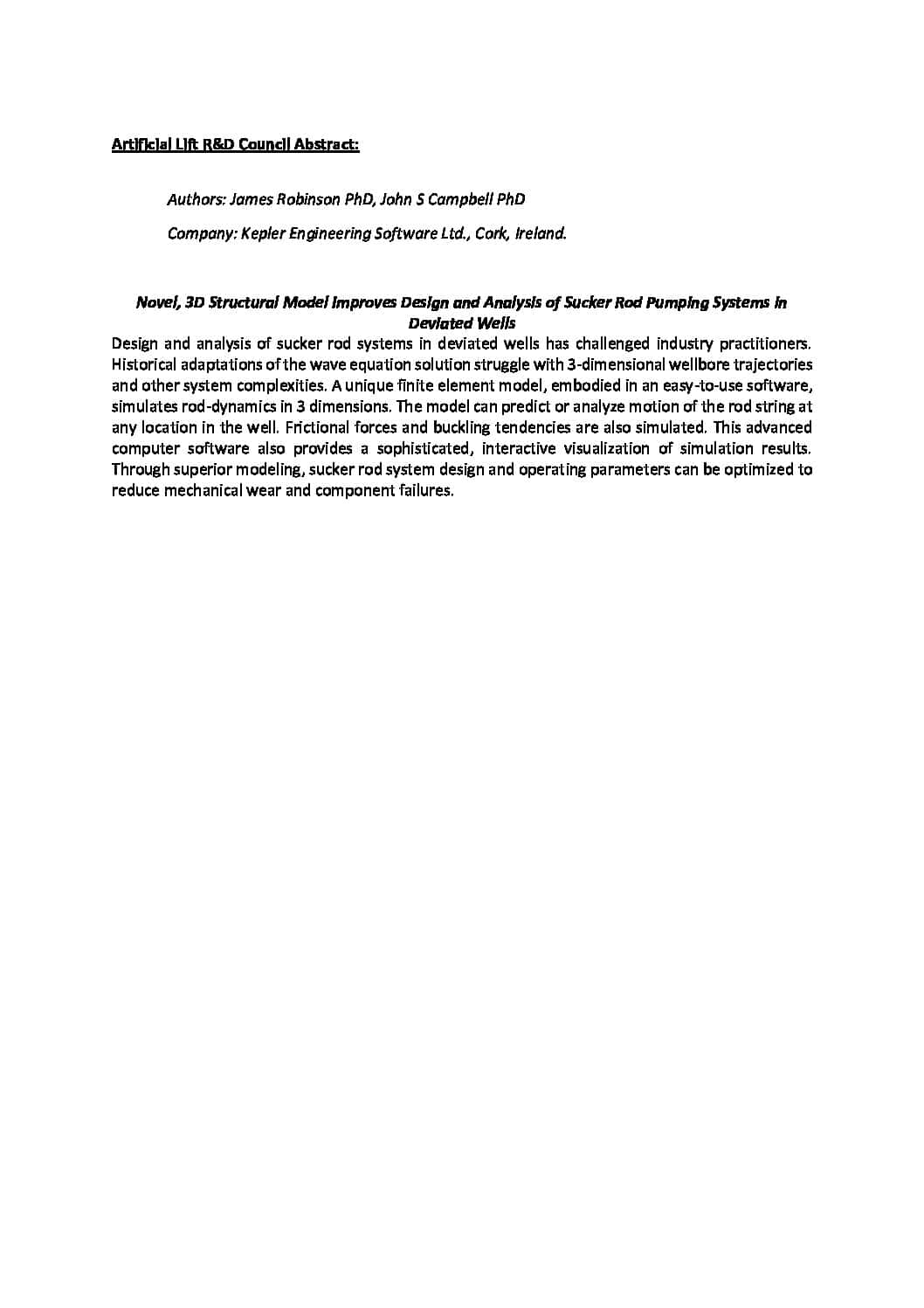 Novel, 3D Structural Model Improves Design and Analysis of Sucker Rod Pumping Systems in Deviated Wells Dr. James Robinson – Kepler Engineering Software Dr. John Campbell – Kepler Engineering Software 2023 ALRDC International Sucker Rod Pumping Workshop Midland, TX, USA August 28-31 Design and analysis of sucker rod systems in deviated wells has challenged industry […]
