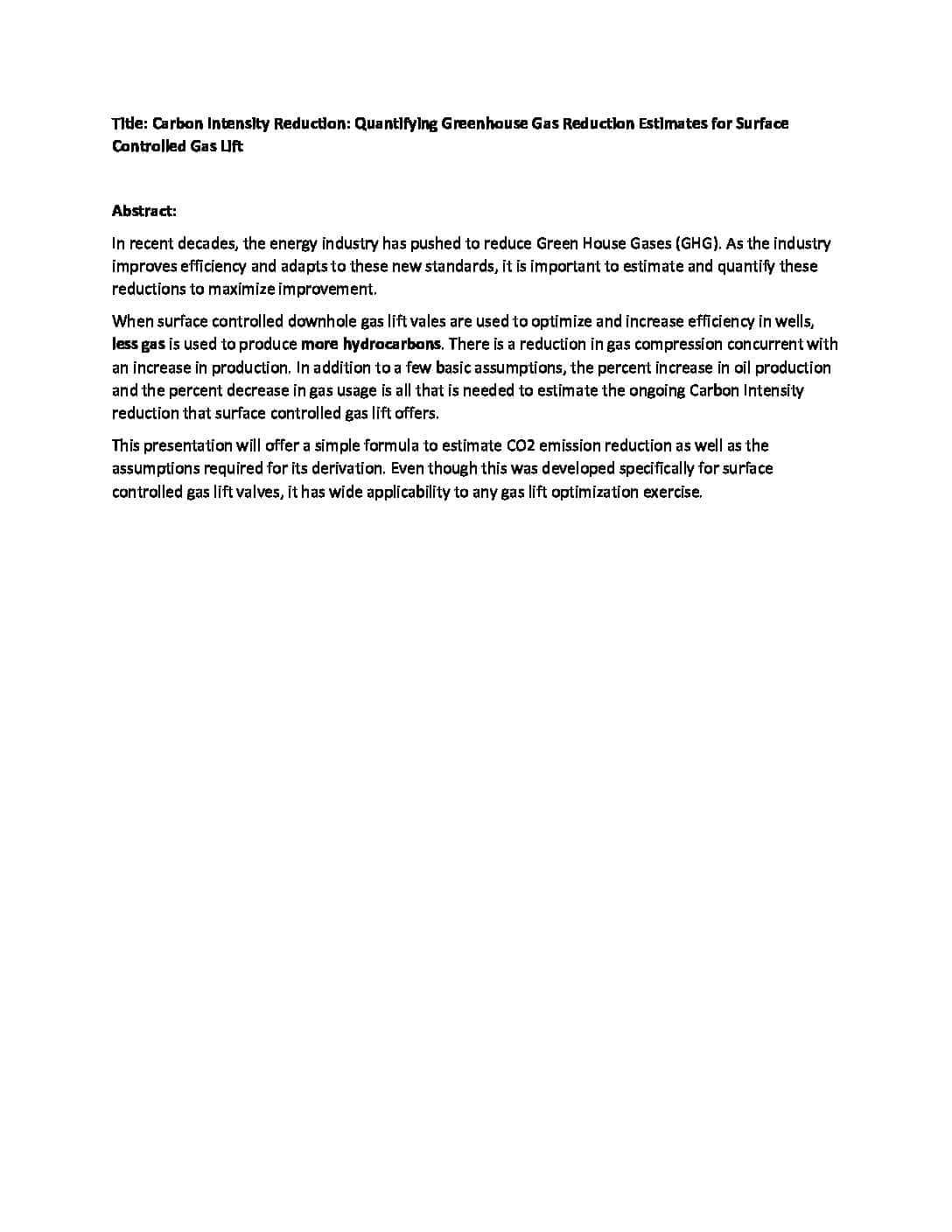 Carbon Intensity Reduction: Quantifying Greenhouse Gas Reduction Estimates for Surface Controlled Gas Lift