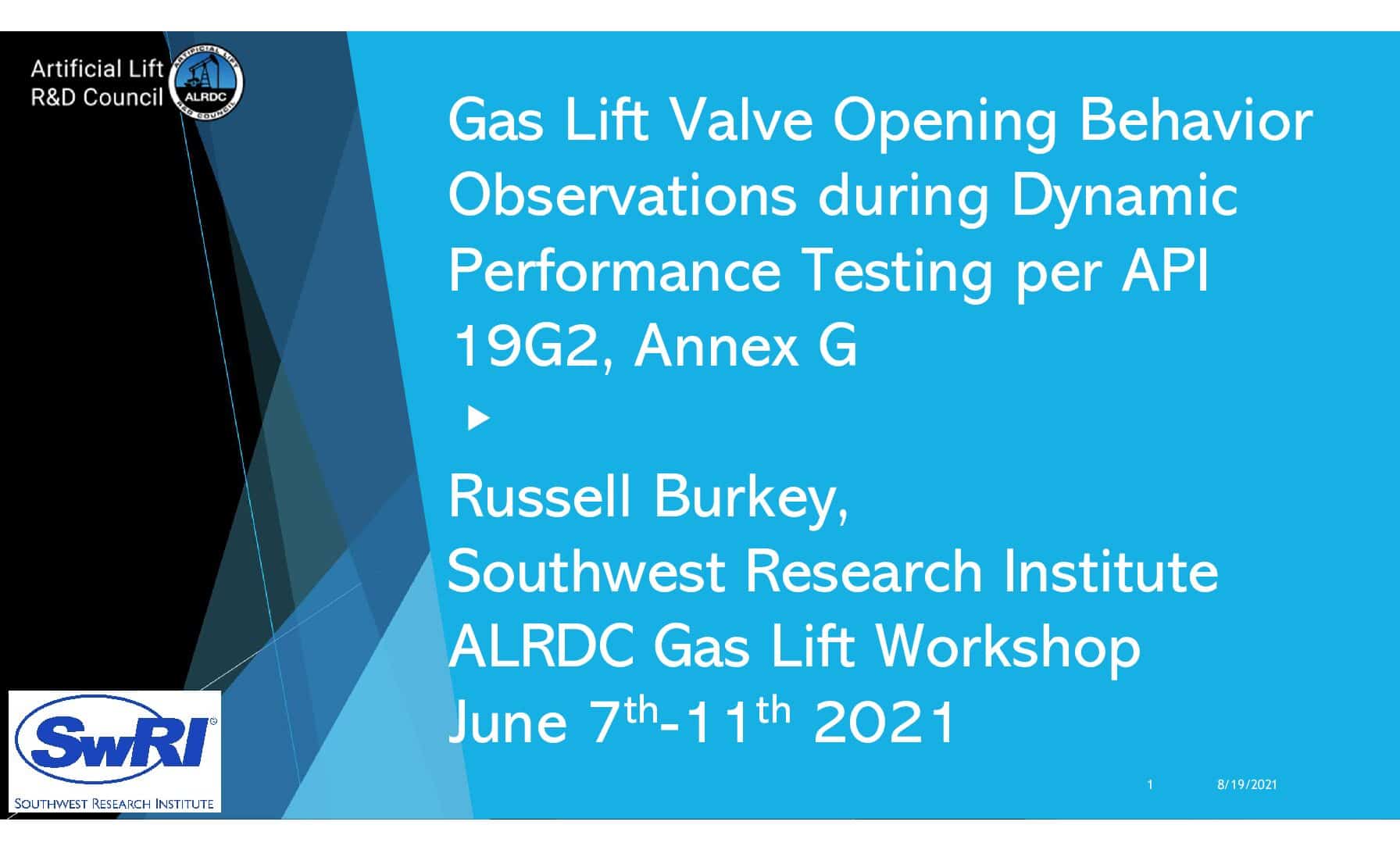 Gas Lift Valve Opening Behavior Observations during Dynamic Performance Testing per API 19G2, Annex G Russell Burkey – Southwest Research Institute 2021 ALRDC Gas Lift Workshop Virtual June 7th-11th