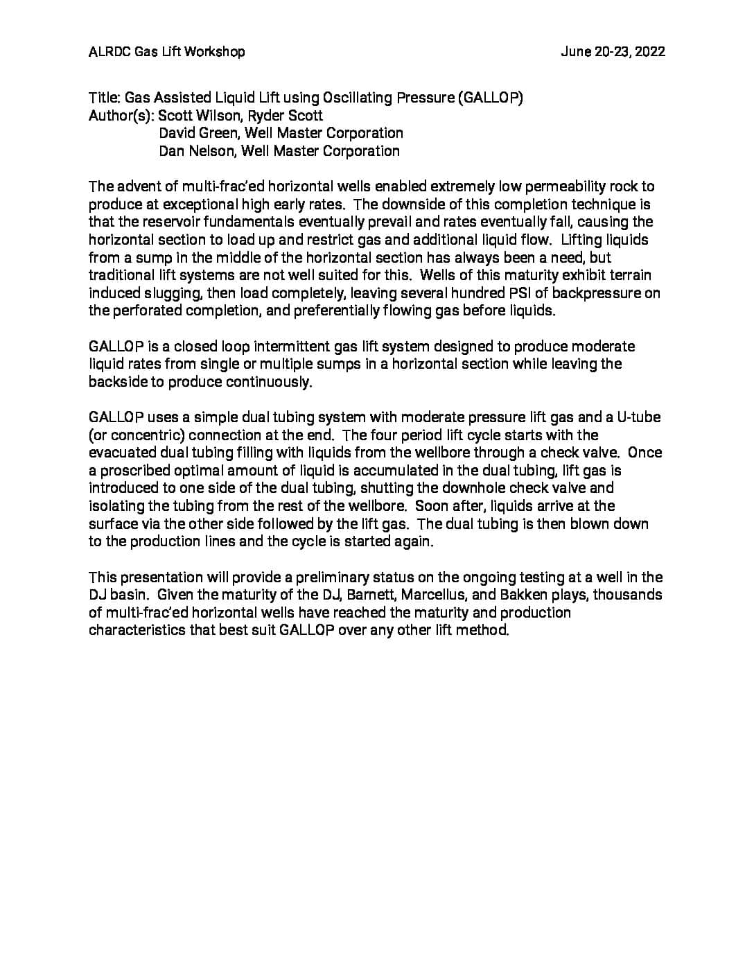 Gas Assisted Liquid Lift using Oscillating Pressure (GALLOP) Scott Wilson – Ryder Scott David Green – Well Master Corporation Dan Nelson – Well Master Corporation 2022 ALRDC Gas Lift Workshop Houston, Texas June 20-23 The advent of multi-frac’ed horizontal wells enabled extremely low permeability rock to produce at exceptional high early rates. The downside of […]