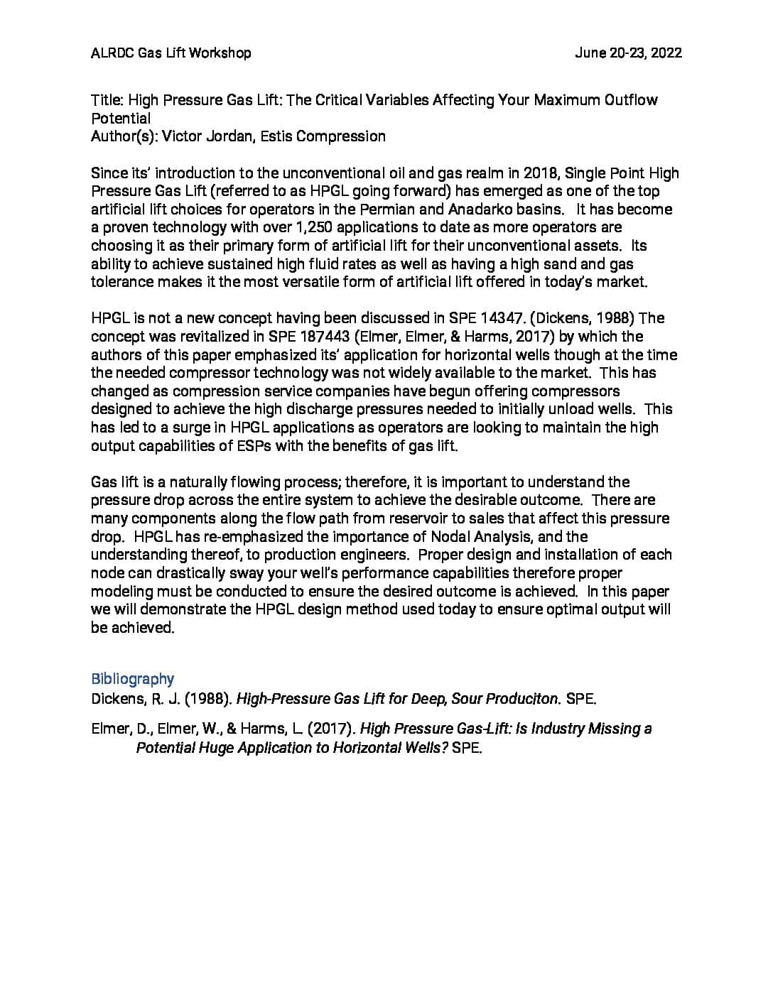 High-Pressure Gas Lift: The Critical Variables Affecting Your Maximum Outflow Potential Victor Jordan – Estis Compression 2022 ALRDC Gas Lift Workshop Houston, Texas June 20-23, 2022 Since its’ introduction to the unconventional oil and gas realm in 2018, Single Point High Pressure Gas Lift (referred to as HPGL going forward) has emerged as one of […]