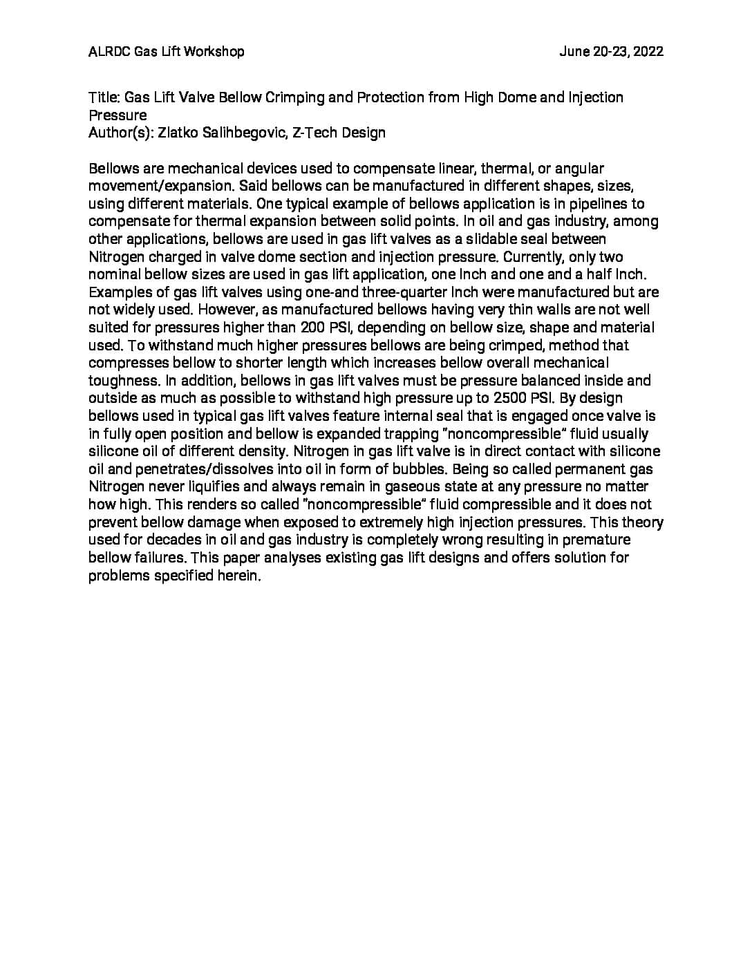 Gas Lift Valve Bellow Crimping and Protection from High Dome and Injection Pressure Zlatko Salihbegovic – Z-Tech Design 2022 ALRDC Gas Lift Workshop Houston, Texas June 20-23 Bellows are mechanical devices used to compensate linear, thermal, or angular movement/expansion. Said bellows can be manufactured in different shapes, sizes, using different materials. One typical example of […]