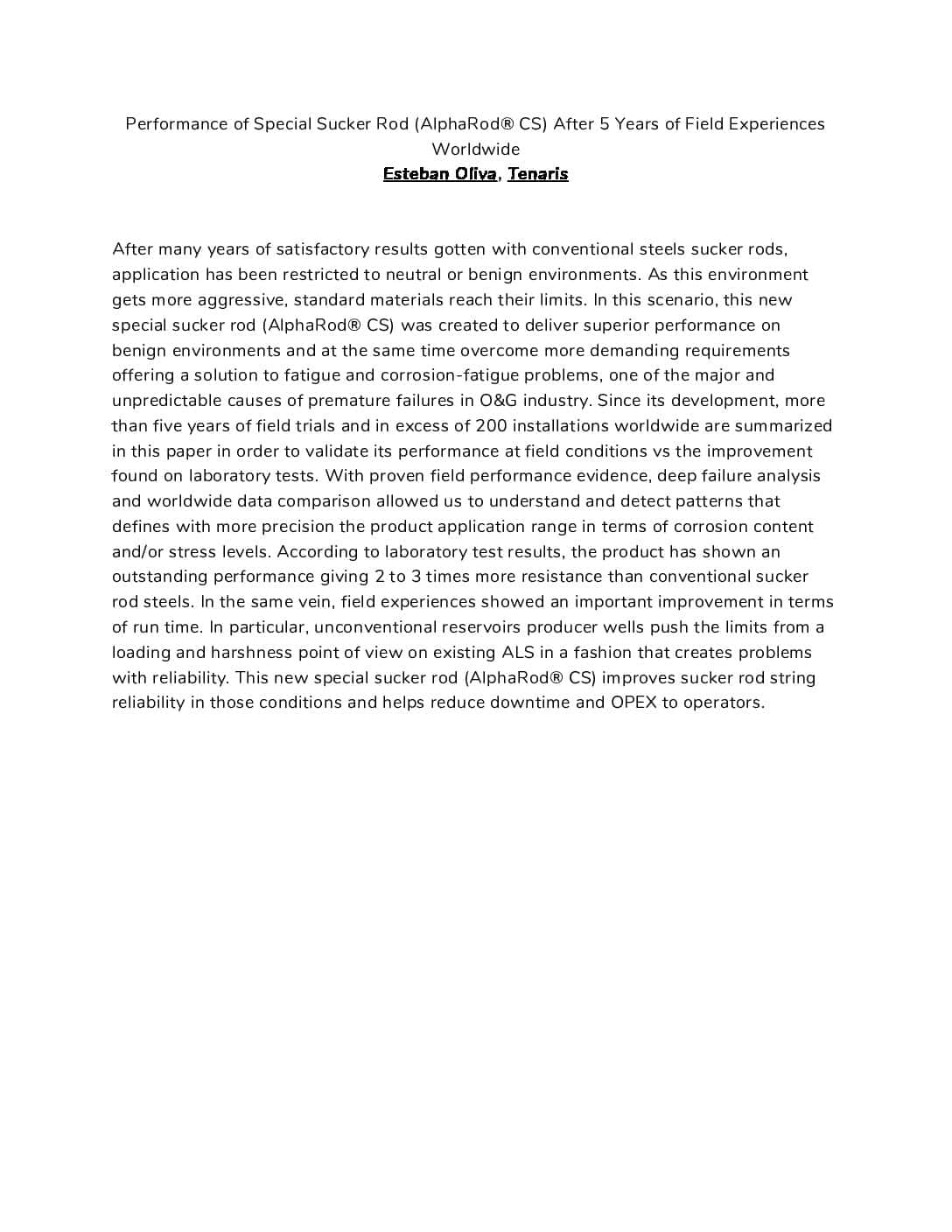 Performance of Special Sucker Rod (AlphaRod® CS) After 5 Years of Field Experiences Worldwide